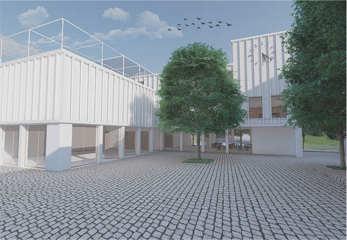 Součástí návrhu je také nově vzniklá hmota uzavírající východní část náměstí. Návrh stanovuje pouze hmotovou vizi toho jak doplnit centrum obce. Za ideální využití těchto hmot považuji – obchodní parter, vyšší patra bydlení.