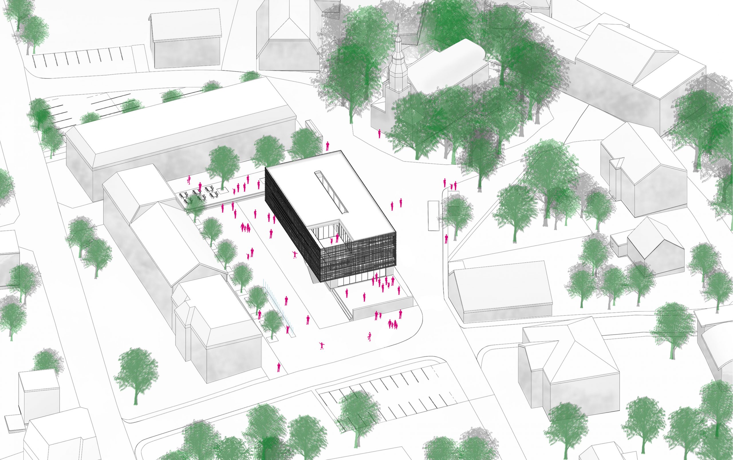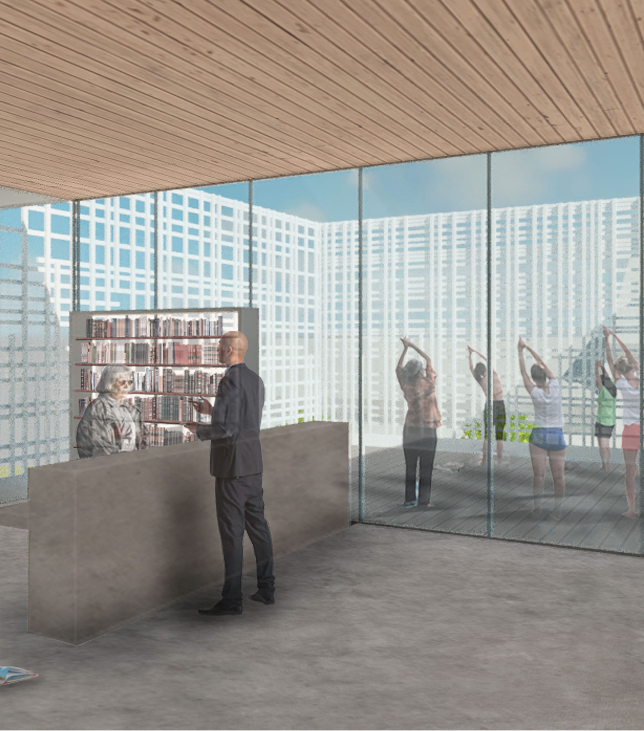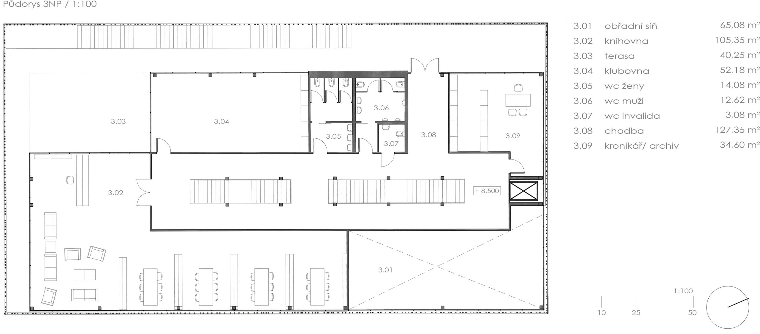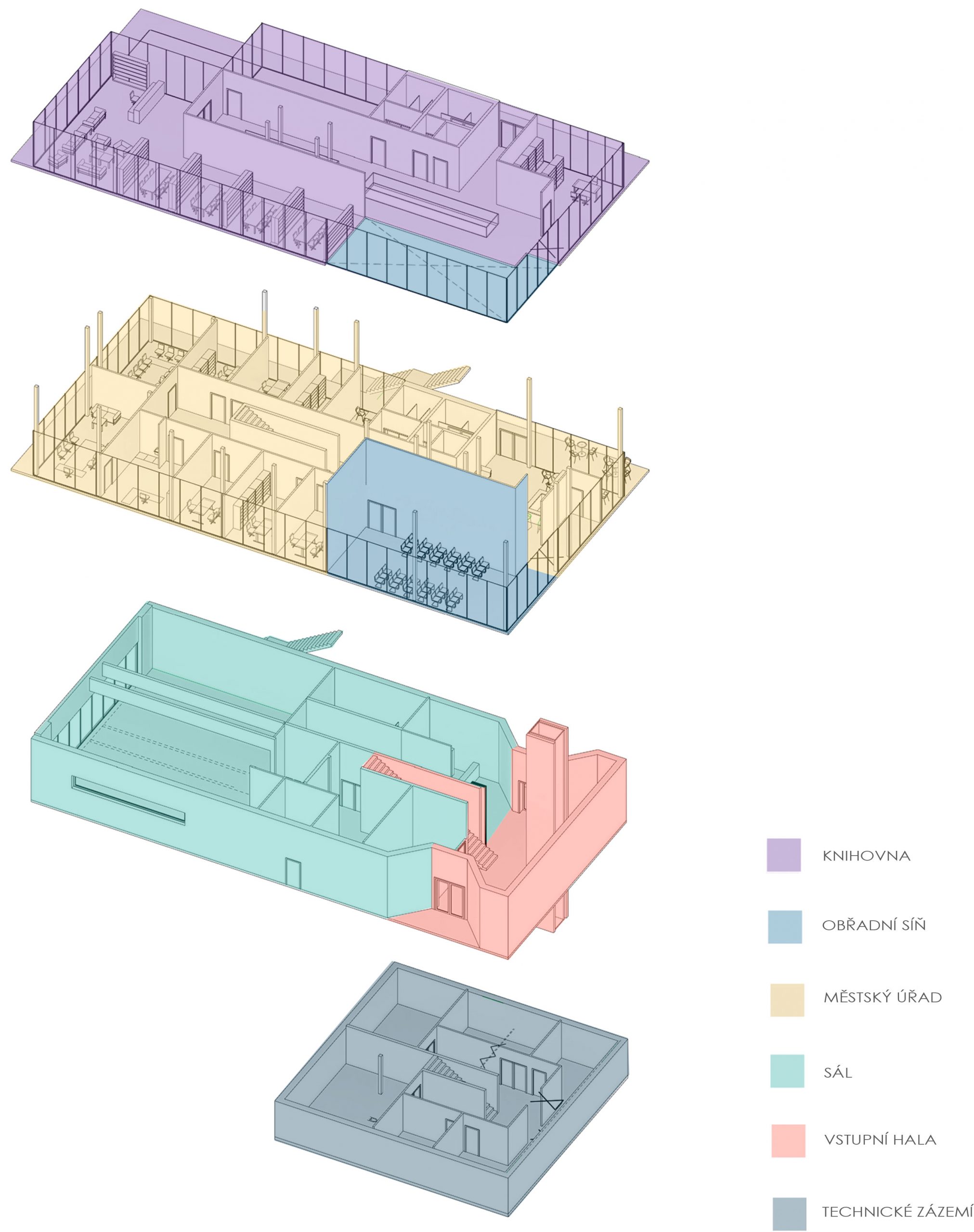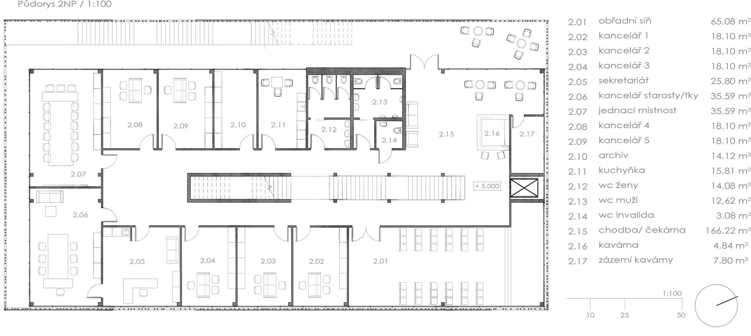 - 2NP je vyhraněno pro městský úřad s obřadní síní, která prochází dvěma patry.