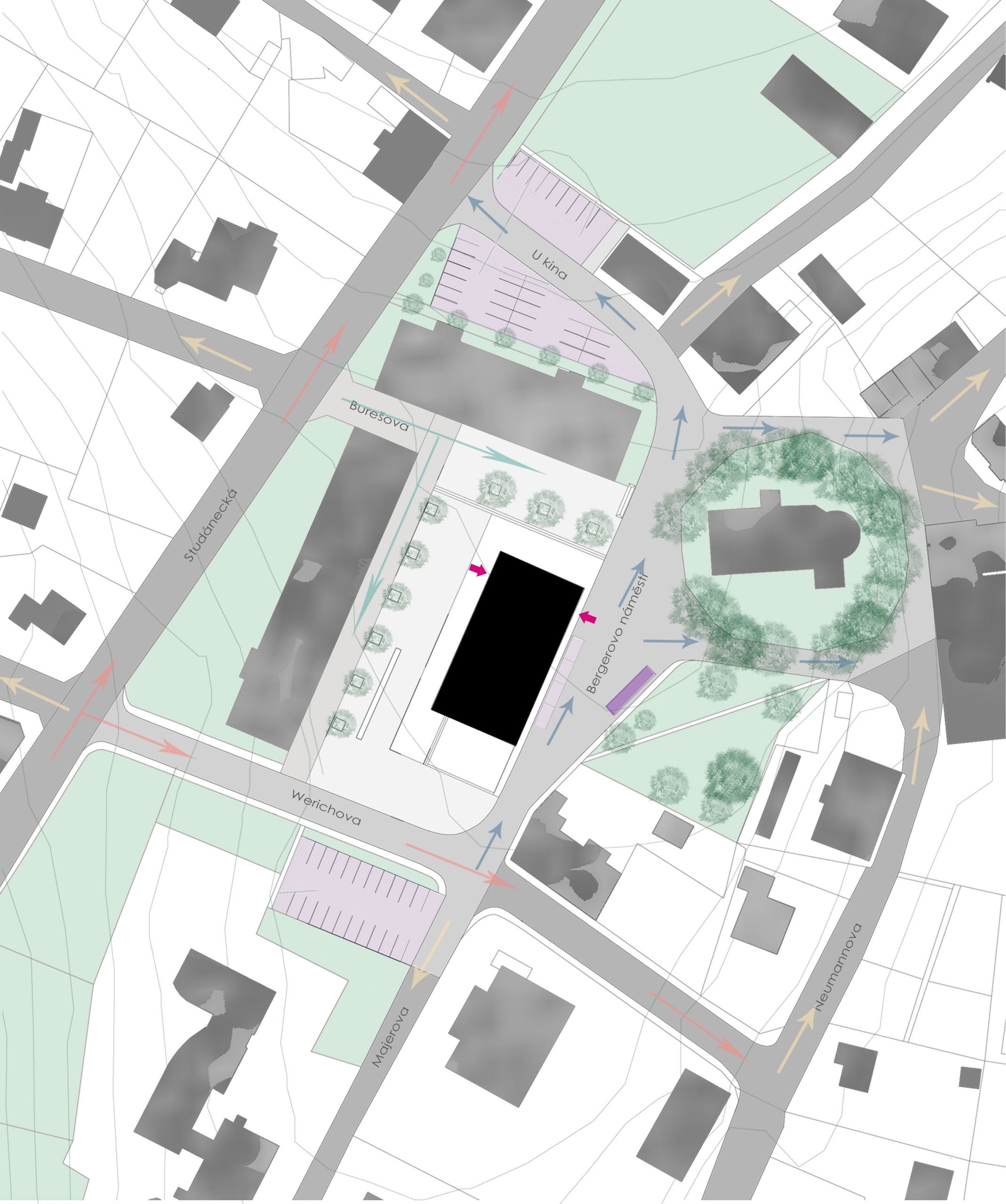 Silnice okolo náměstí, kde se bude pohybovat více lidí, je materiálově odlišená. Místo asfaltu by zde byly dlažební kostky, kvůli kterým by řidiči museli jet pomaleji. Do náměstí může zasáhnout a vjet pouze zásobování či hasiči nebo sanitky. Vznikli zde 2 větší parkovací plochy, na severu a na jihu, obě mají kapacitu 24 stání. Dále je parkování u hřiště a pár míst podél obecního domu.