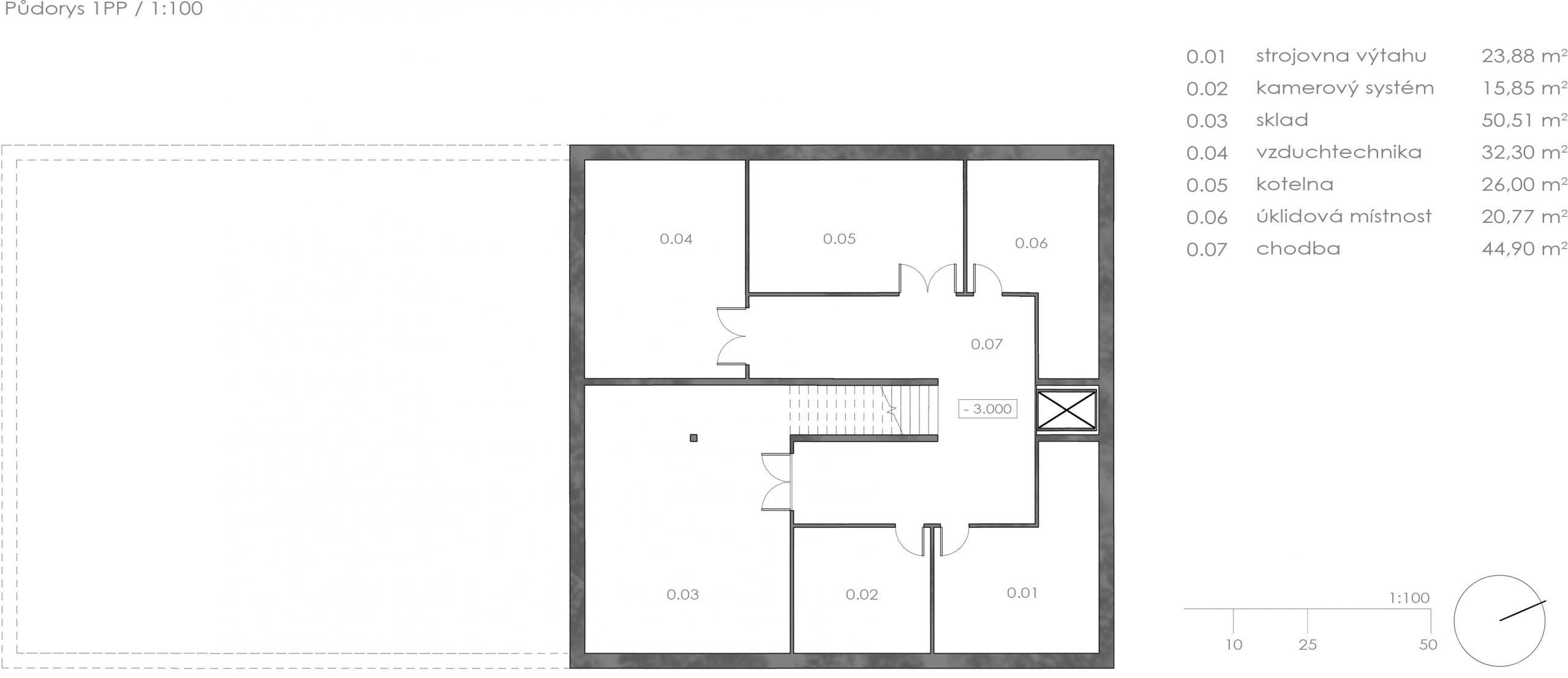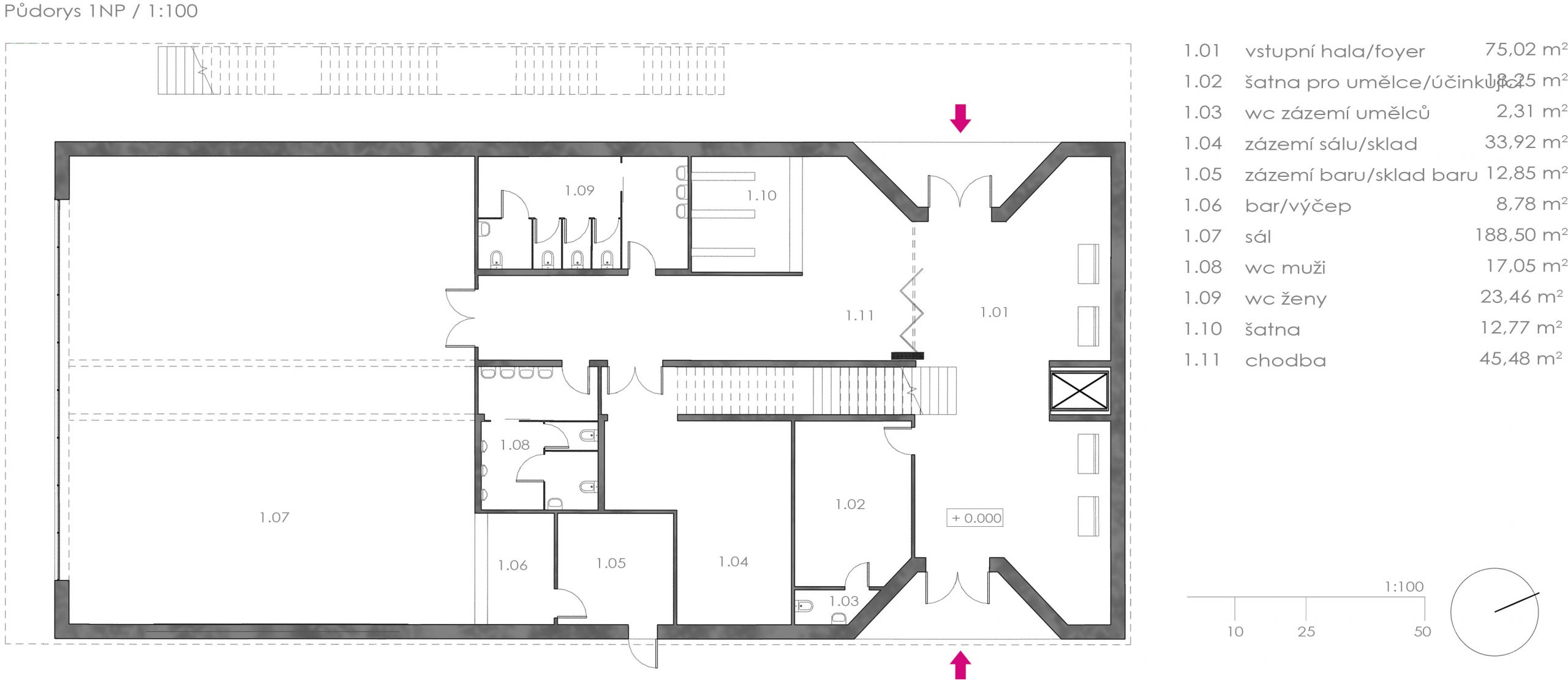 - 1.NP – zde je umístěna vstupní hala se sálem.